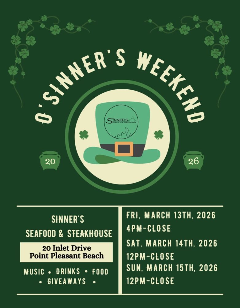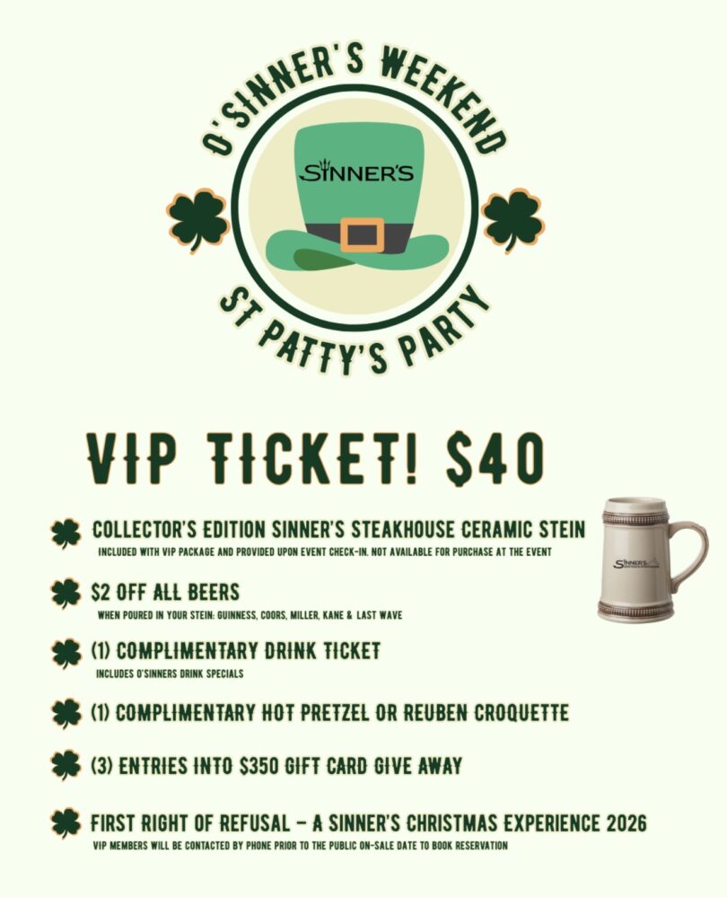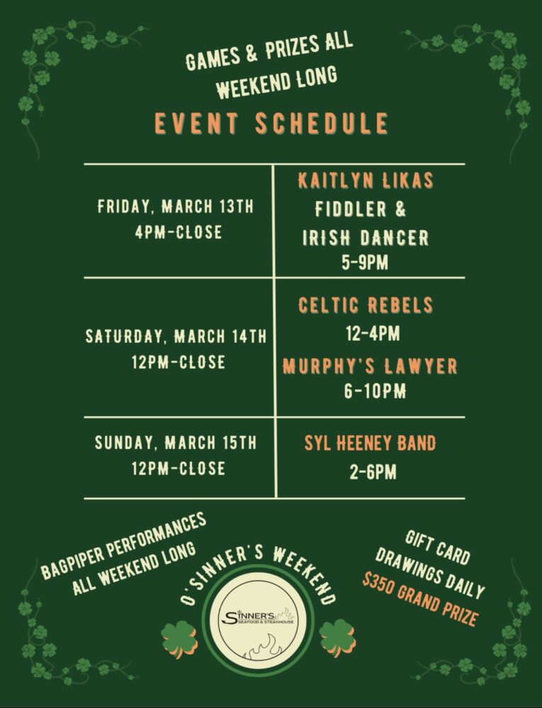 It’s that time of year again! Sinner’s Seafood & Steakhouse’s annual O’Sinner’s St. Patrick’s Day weekend will run from March 13th – March 15th. Don’t miss out on authentic Irish fare & music, drink specials & HUGE giveaways.